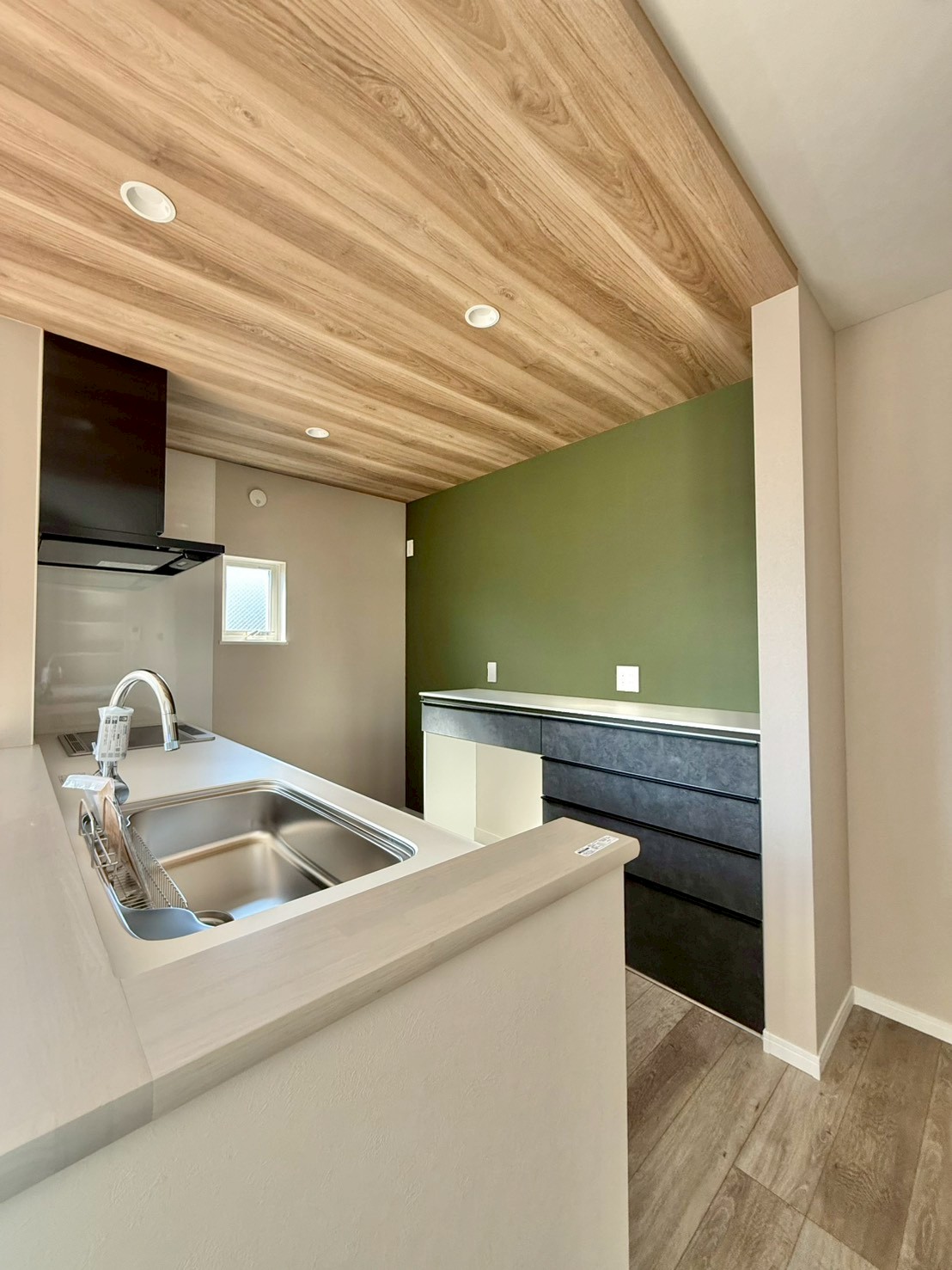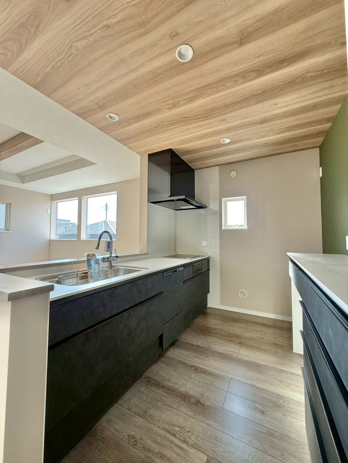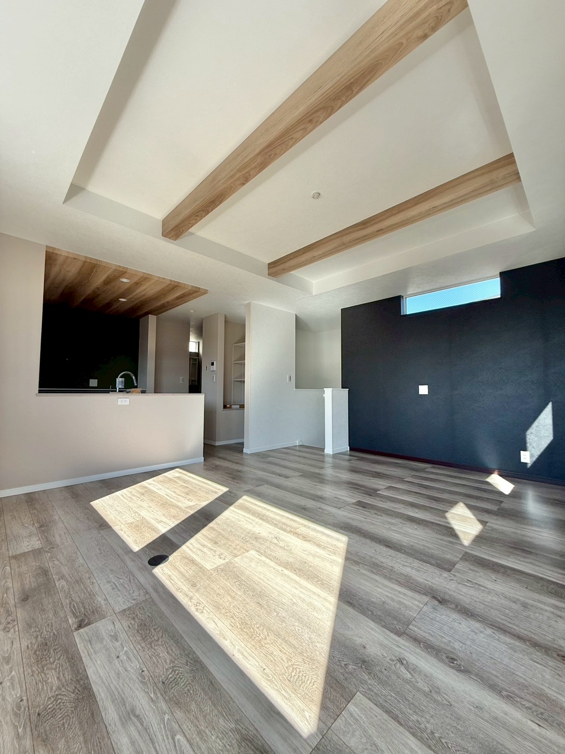 • 大空間: 高天井と大型FIX窓で、開放感バツグンのLDK。